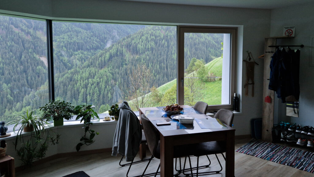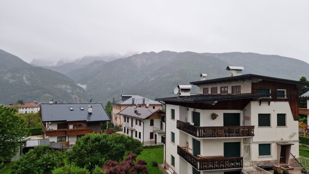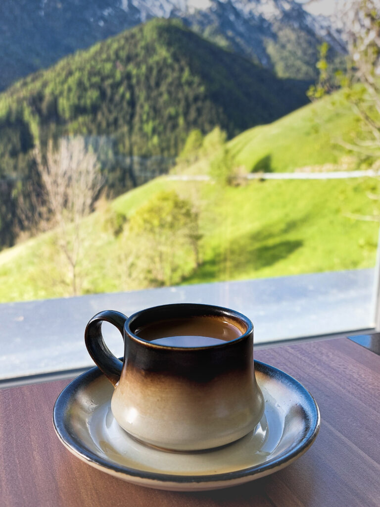 Выспались отлично. Утром — горный пейзаж с балкона, колокола в церкви, и облака, скрывающие и оголяющие вершины. Свежий воздух, чашка кофе, вкусный завтрак.