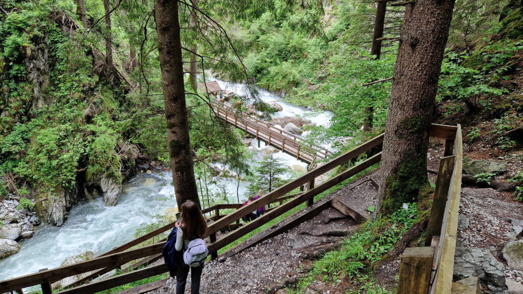 Дальше тропа проходит прямо по отвесным стенам ущелья. Но всё оборудовано отлично: поручни, крепкие мостики. Безопасно и очень живописно. Особенно впечатляют участки, где вода с грохотом падает вниз и разбивается о скалы. Брызги, свежий воздух и мощная энергетика воды — невозможно не остановиться и просто смотреть.