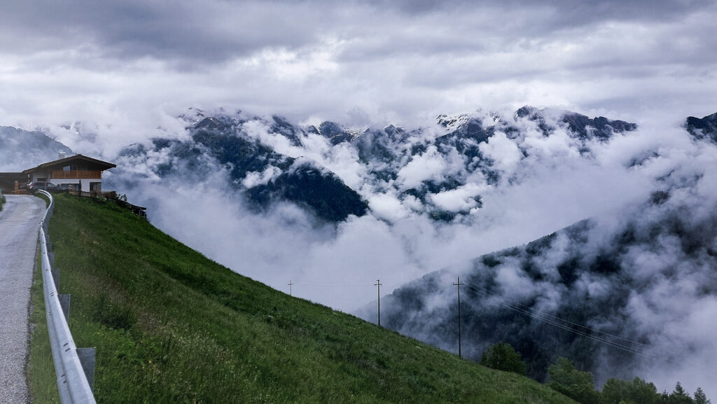Последняя ночь в горах… С утра небо снова затянуто облаками, а дождь стучит по стеклу. Горы скрылись в тумане, и казалось, что погода решила попрощаться с нами в своей драматичной манере. Загрузить вещи в багажник на крыше было невозможно — лило как из ведра. Но моментами облака расходились, и между ними выглядывали белые пики.