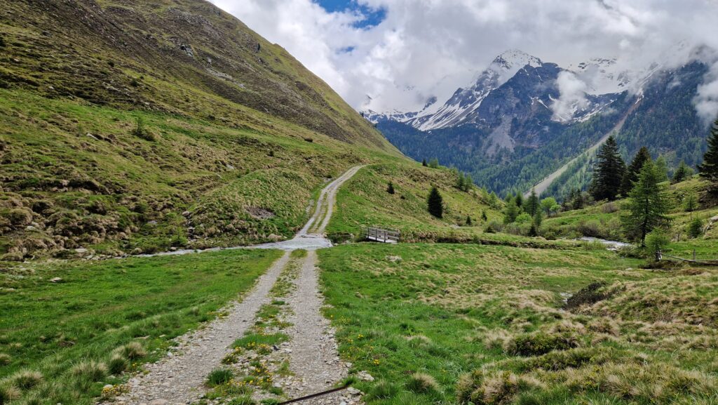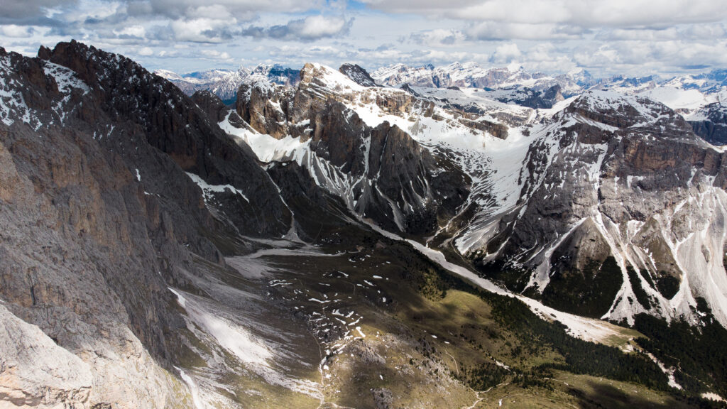 Такие контрасты — норма для Доломит. Снег наверху, весенние цветы чуть ниже, а в долине уже ягоды собирают.