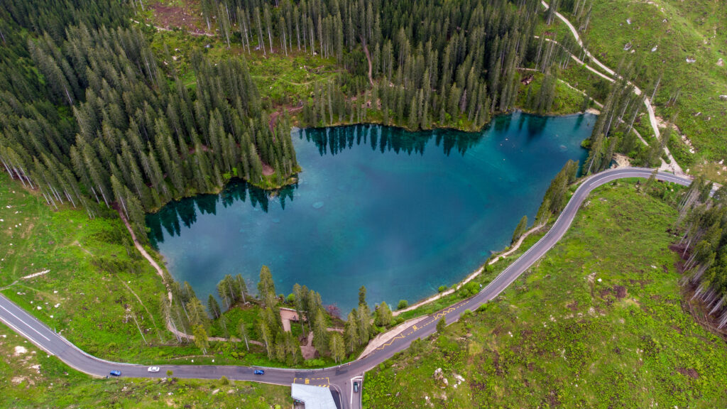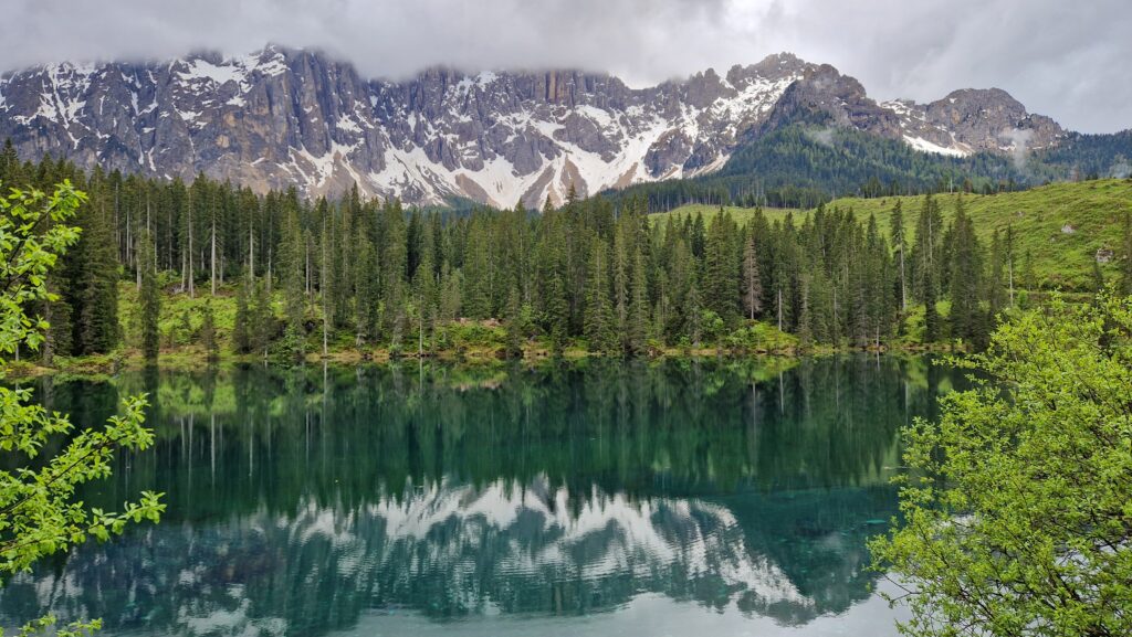 Озеро Карецца — отличное место для неспешной прогулки, фото и тишины. Оно как будто создано для того, чтобы просто постоять и полюбоваться.