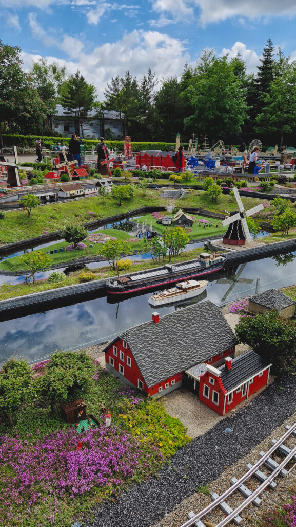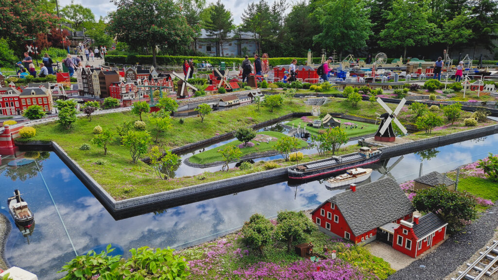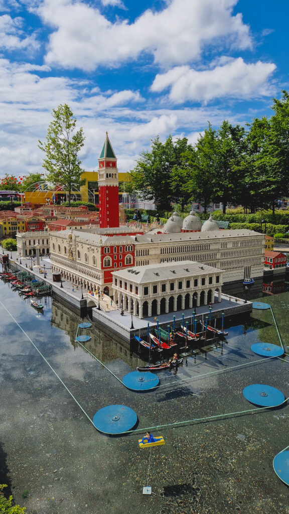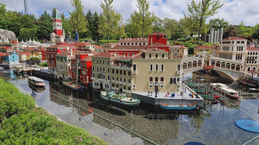 По территории парка можно прокатиться на маленьком поезде и осмотреть все через окно поезда. А можно просто не спеша прогуляться. Что мы и сделали. Нас очень впечатлило сделанные из Лего копии городов, таких как Лондон, Берлин, Венеция и др. Здесь даже плавают корабли и передвигаются машины.
