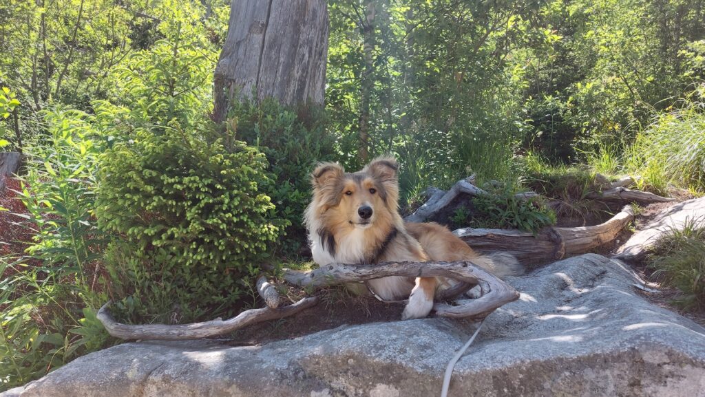 Я довёз всех до старта, сам оставил машину и догнал своих через 40 минут. Шли неспешно, наслаждаясь тенью деревьев, журчанием воды, красотой гор. Джерри постоянно нырял в воду — его способ охлаждаться.
